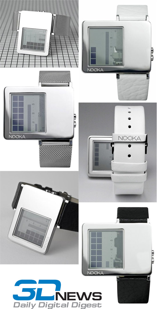 Компания Nooka, известный производитель наручных часов, выпустила новую линейку своей продукции под названием ZAZ. Новые часы имеют очень необычный вид - вместо привычного циферблата на экране отображаются диаграммы, где каждый столбец определяет час, минуту и секунду. Кроме этого, стальной корпус устройства расположен слегка асимметрично, а дисплей, на котором показывается время, полупрозрачный, поэтому сквозь него видна рука человека и ремешок.
